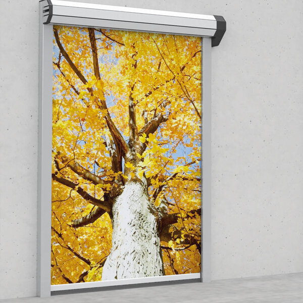 Hurtigporte med et portgardin i ét stykke kan forsynes med et tryk efter eget valg. Det kan være virksomhedens logo, et flot billede af virksomheden, omgivelserne eller jeres produkter. Søjlerne og kappen kan også leveres i en RAL-farve.
